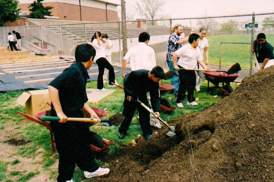 7th grade students shovel soil into wheelbarrows to fill the raised beds they are building for their school, Spring 2002